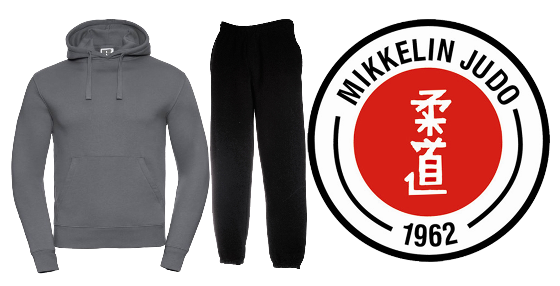 Kokonaisuus sisältää collagehupparin ja collagehousut. Huppari tulee olemaan harmaa (convoy grey), johon tulee rintaan Mikkelin Judon logo koossa 70mm ja selkään koossa 200mm. Housut ovat mustat joihin tulee reiteen logo koossa 70mm.
