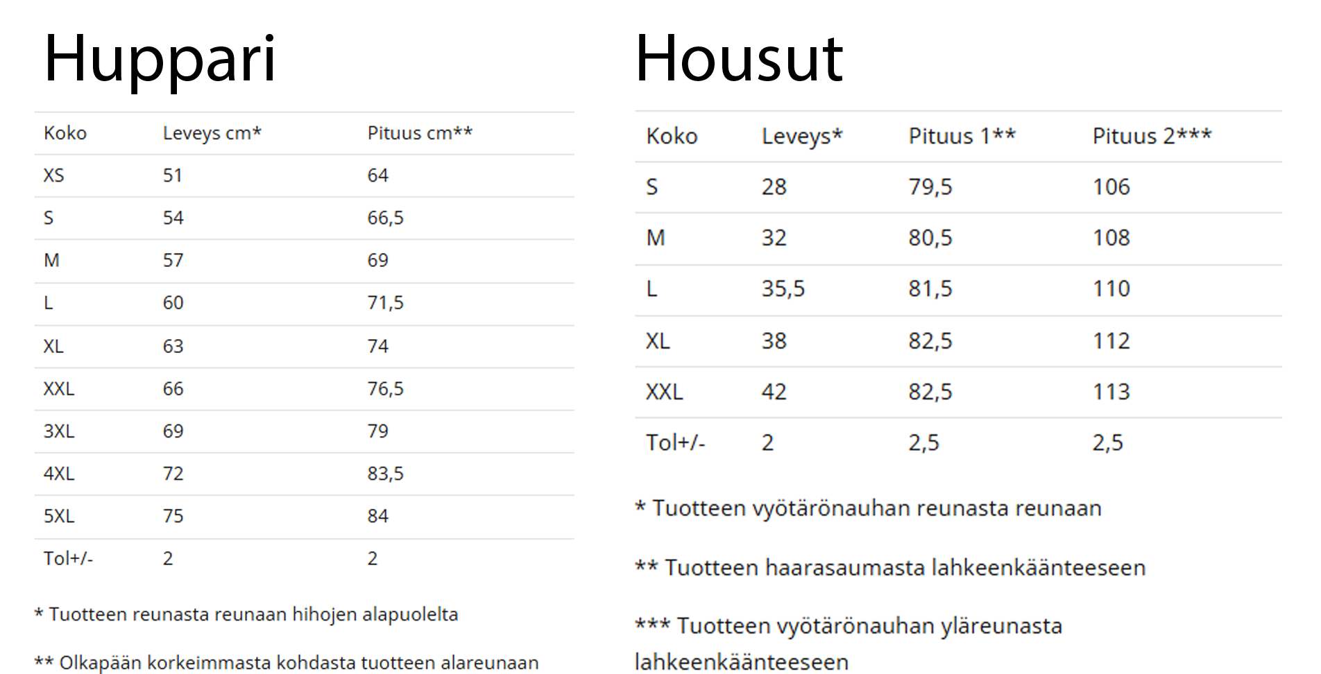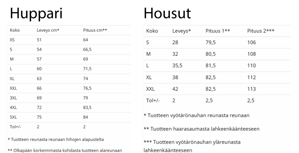 Suuntaa antavat kuvat ja kokotaulukot alla.
